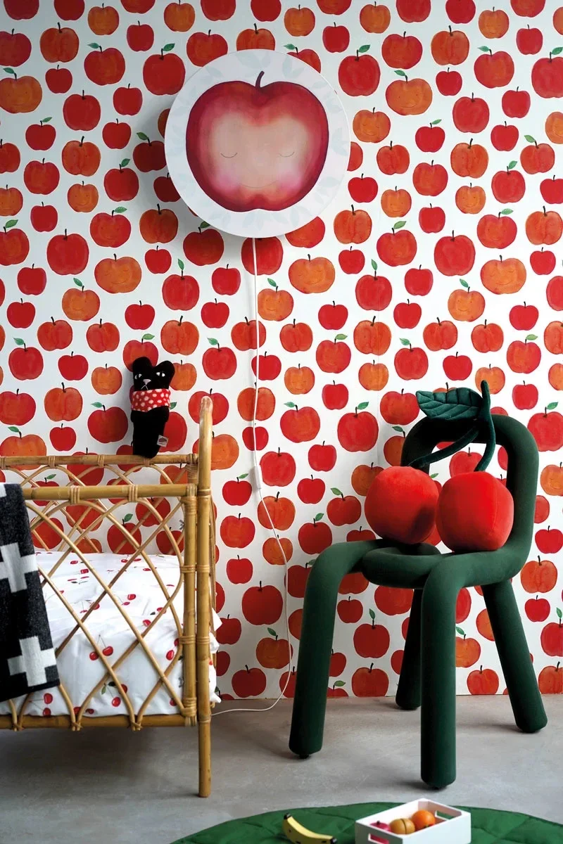 Leuke combinatie met Funky Appels behang, muursticker Eekhoorntje of behangcirkel Klaprozendroom.