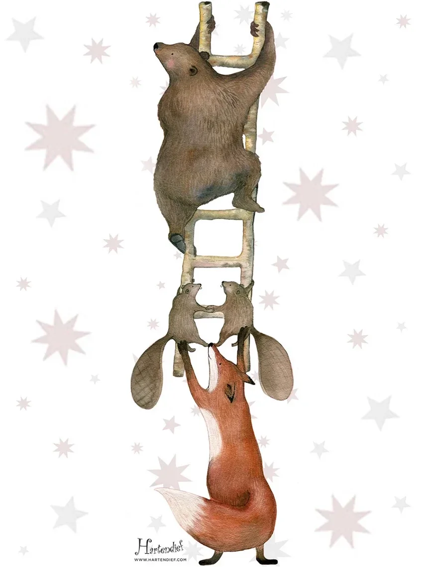 Hoger en hoger klimt Beertje....Vos en de Bevertjes houden de ladder stevig vast.