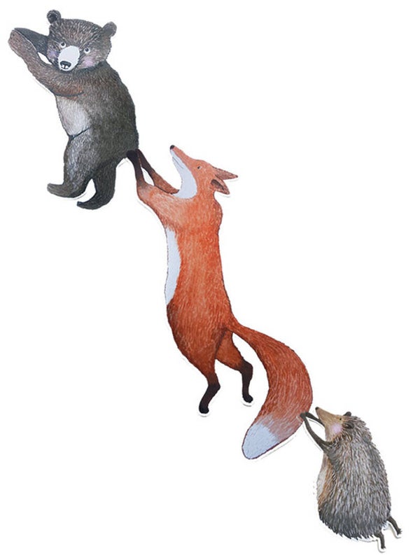 Beertje, Vosje en Egeltje houden zich stevig vast aan de staart van Kleine Ster.