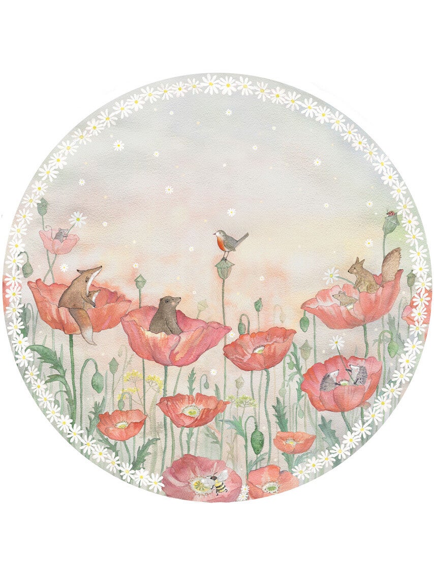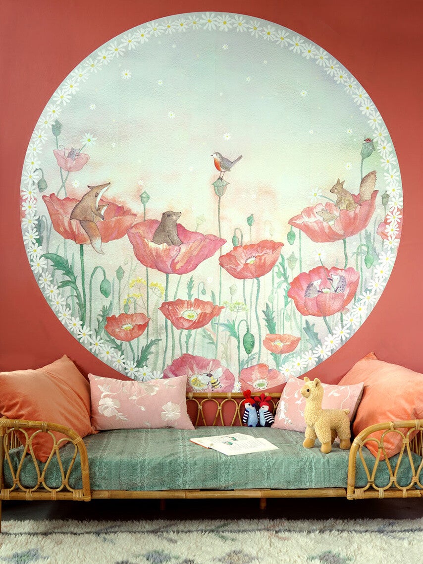 Deze Klaprozendroom behangcirkel is van vliesbehang heeft een diameter van 190 centimeter. Het behangpapier is mat en diep van kleur.