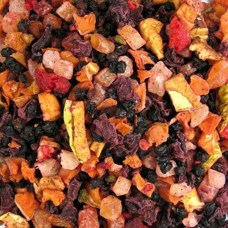 Ingrediënten: stukjes appel, stukjes rode biet, stukjes wortel, vlierbessen, stukjes ananas, stukjes papaja, natuurlijk aroma, stukjes framboos.