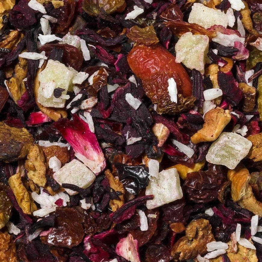 Ingrediënten: hibiscusbloesems, rozenbottelschillen, stukjes appel, stukjes ananas, geraspte kokosnoot, natuurlijk aroma.