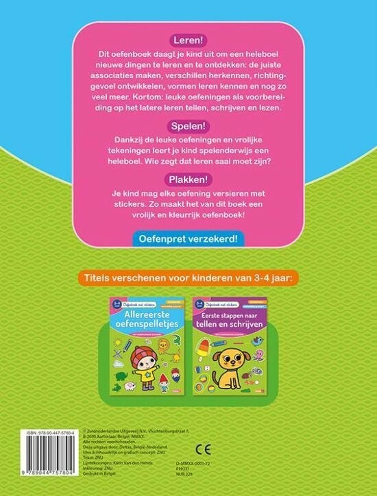 Dit oefenboek daagt je kind uit om een heleboel nieuwe dingen te leren en te ontdekken: de juiste associaties maken, verschillen herkennen, richtinggevoel ontwikkelen, vormen leren kennen en nog zo veel meer. Dankzij de speelse oefeningen en leuke tekeningen leert je kind spelenderwijs een heleboel bij. Bovendien zitten er stickers bij waarmee uw kind de oefeningen kan versieren. Zo maakt het van dit boek een vrolijk en kleurrijk oefenboek! Oefenpret verzekerd!