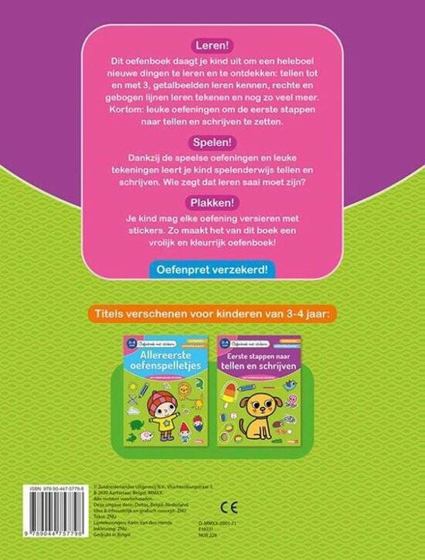 Dit oefenboek daagt je kind uit om een heleboel nieuwe dingen te leren en te ontdekken: tellen tot en met 3, getalbeelden leren kennen, rechte en gebogen lijnen leren tekenen en nog zo veel meer. Dankzij de speelse oefeningen en leuke tekeningen leert je kind spelenderwijs tellen en schrijven. Bovendien zitten er stickers bij waarmee uw kind de oefeningen kan versieren. Zo maakt het van dit boek een vrolijk en kleurrijk oefenboek! Oefenpret verzekerd!