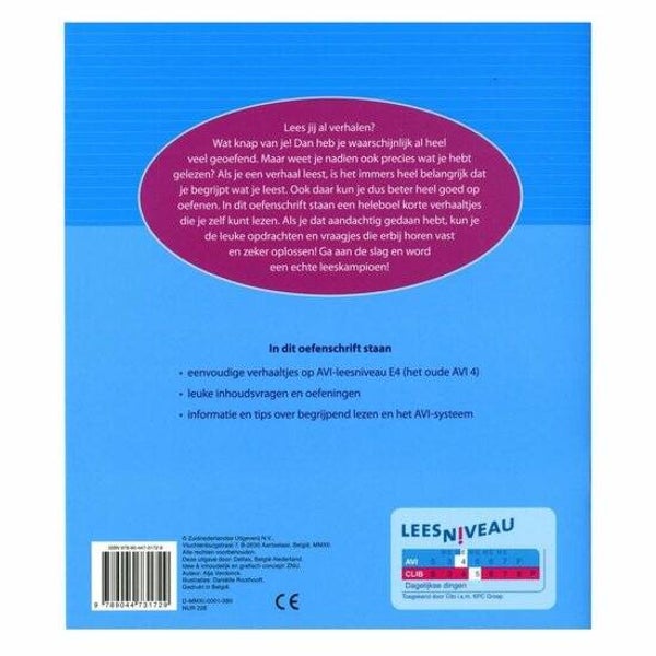 Lees jij al verhalen? Wat knap van je! Dan heb je waarschijnlijk al heel veel geoefend. Maar weet je nadien ook precies wat je hebt gelezen? Als je een verhaal leest, is het immers heel belangrijk dat je begrijpt wat je leest. Ook daar kun je dus beter heel goed op oefenen. In dit oefenschrift staan een heleboel korte verhaaltjes die je zelf kunt lezen. Als je dat aandachtig gedaan hebt, kun je de leuke opdrachten en vraagjes die erbij horen vast en zeker oplossen! Ga aan de slag en word een echte leeskampioen! In dit oefenschrift staan * eenvoudige verhaaltjes op leesniveau AVI E4 (het oude AVI 4) * leuke inhoudsvragen en oefeningen * informatie en tips over begrijpend lezen en het AVI-systeem