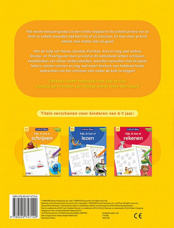 Het eerste leerjaar/groep 3 is een echte mijlpaal in de schoolcarrière van je kind: in enkele maanden tijd leert hij of zij schrijven. En hoe meer je kind oefent, hoe vlotter dat zal gaan! Met de hulp van Nemo, Jasmine, Pumbaa, Arlo en nog veel meer andere Disneyfiguren leert je kind in dit oefenboek letters schrijven, tweeklanken van elkaar onderscheiden, woorden aanvullen met de juiste letters, zinnen vormen en nog veel meer! Kortom, een heleboel leuke opdrachten om het schrijven vlot onder de knie te krijgen! Oefenen hoeft helemaal niet saai te zijn! Dankzij de vrienden van Disney wordt leren een feest!