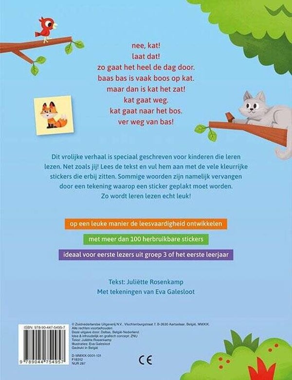 nee, kat! laat dat! zo gaat het heel de dag door. baas bas is vaak boos op kat. maar dan is kat het zat! kat gaat weg. kat gaat naar het bos. ver weg van bas! Dit vrolijke verhaal is speciaal geschreven voor kinderen die leren lezen. Net zoals jij! Lees de tekst en vul hem aan met de vele kleurrijke stickers die erbij zitten. Sommige woorden zijn namelijk vervangen door een tekening waarop een sticker geplakt moet worden. Zo wordt leren lezen echt leuk! - op een leuke manier de leesvaardigheid ontwikkelen - met meer dan 100 herbruikbare stickers - ideaal voor eerste lezers uit groep 3 of het eerste leerjaar Tekst: Juliëtte Rosenkamp Met tekeningen van Eva Galesloot