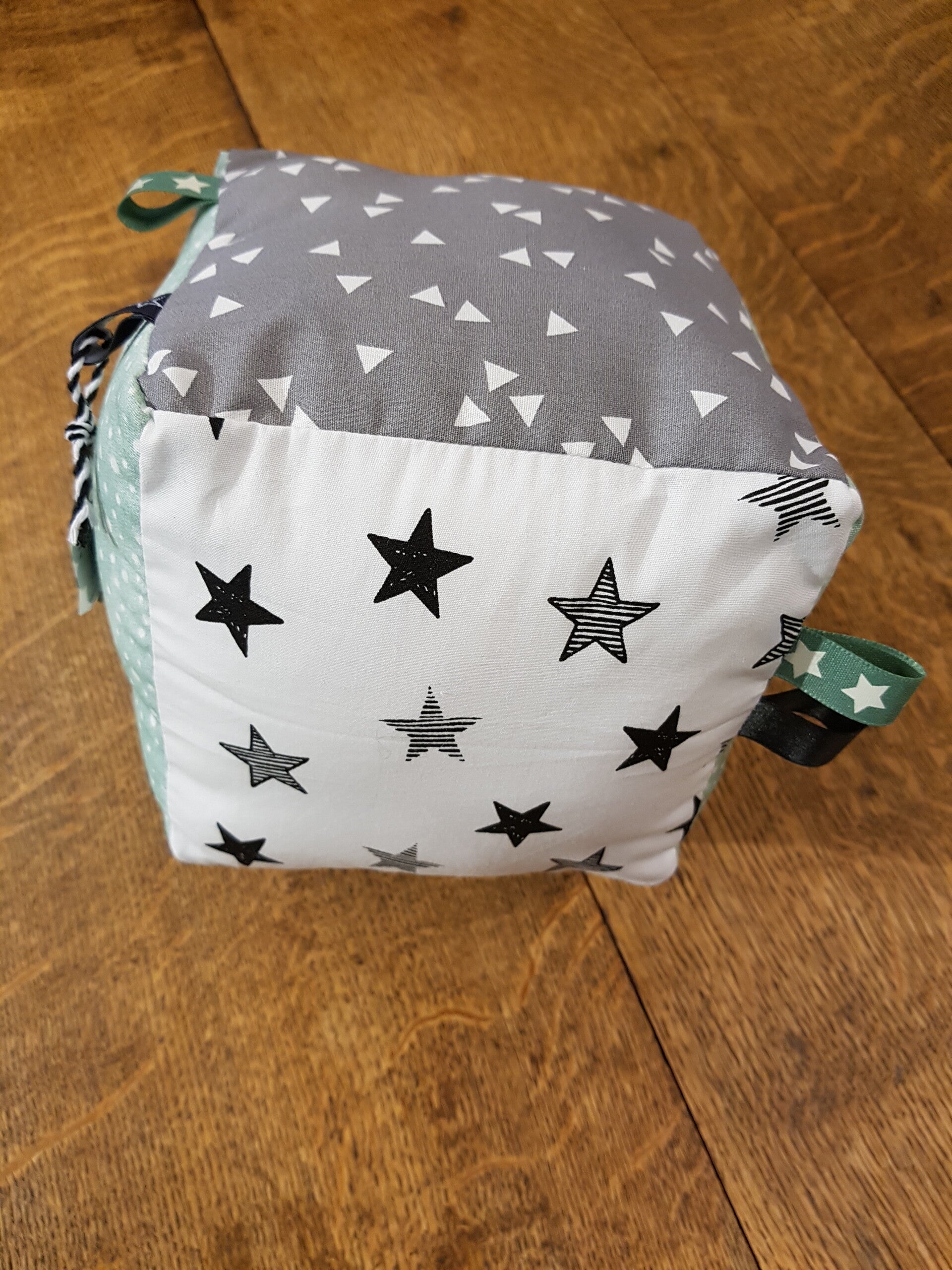 Een speelkubus van BY CHANTI is leuk voor je kleintje om mee te spelen. De kubus is helemaal van stof, dus lekker zacht. Er zitten labeltjes en houten figuurtjes aan waar ze mee kunnen spelen, deze zijn goed voor de motorische ontwikkeling. Daarnaast zit er een belletje in zodat je kleintje de kubus ook hoort. Leuk om te geven & te krijgen. Speelkubus kleur en print: Groen, Grijs en Wit