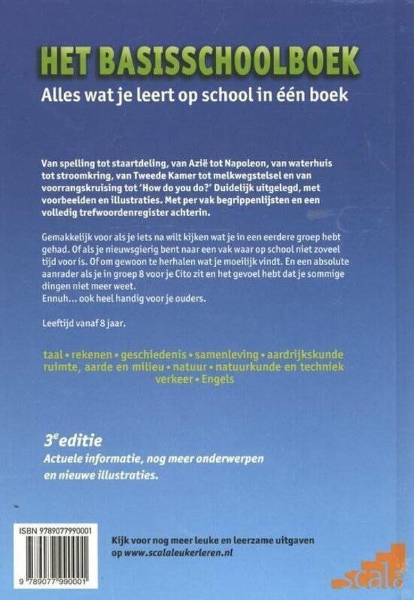 Het Basisschoolboek 3e editie Alles wat je leert op school in één boek Van spelling tot breuk, van Azië tot Napoleon, van waterhuis tot stroomkring en van voorrangskruising tot ‘How do you do’. Duidelijk uitgelegd met voorbeelden, illustraties en kaarten. Met begrippenlijsten en trefwoordenregister. * gemakkelijk als je iets wilt opzoeken * handig voor je Cito * leuk als je nieuwsgierig bent * en ook heel geschikt voor ouders Nieuwe editie: Actuele informatie, nog meer onderwerpen, nieuwe illustraties taal - rekenen - geschiedenis - samenleving - aardrijkskunde - aarde, ruimte en milieu - natuurkunde techniek - natuur - verkeer – Engels